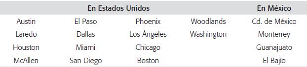 El objetivo de la AEM se manifiesta en su misión: “crear oportunidades de negocio que promuevan el progreso y la innovación, mediante el fortalecimiento de los lazos y el desarrollo de programas que ayudan y guían a los empresarios binacionales y a los empresarios jóvenes para convertirse en líderes mundiales en el crecimiento, el desarrollo y éxito de las empresas” (AEM, 2017). La AEM trabaja intensamente para ampliar sus horizontes, al abrir varias oficinas de apoyo llamadas “capítulos”, en ciudades de Estados Unidos y de México que se muestran en el Cuadro 2. Esta estrategia permite una sinergia entre estas sedes, al apoyar a las empresas mexicanas que quieran invertir en Estados Unidos.
