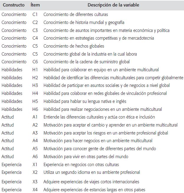 Habilidades: Hunter (2004) en su “Lista de competencias globales” considera que una persona tiene habilidades globales cuando es capaz de vivir y colaborar en otras culturas, de ser miembro participativo en cualquier parte del mundo, tanto en ambientes sociales como empresariales, de colaborar en programas académicos o vocacionales con personas de otras culturas, la habilidad de poder reconocer las diferencias culturales y evaluar el desempeño intercultural. De igual manera, otros estudios señalan que los procesos de globalización y de internacionalización hacen que las empresas busquen en sus trabajadores un alto grado de habilidades relacionadas con el perfil de un empleado global y que generalmente son habilidades muy personales y difíciles de transferir a otros individuos (Chen et al., 2014).
