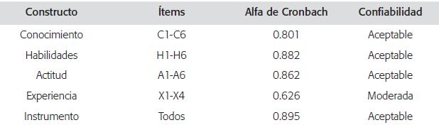 En cuanto a la validación del instrumento de medición, se utilizó la fórmula de Alfa de Cronbach para determinar la confiabilidad del instrumento de recolección de datos probando constructo por constructo y el instrumento global como un todo (Cuadro 5). El resultado del análisis arrojó que el instrumento logró una confiabilidad aceptable, por lo que procedió a su uso en la fase de recolección de datos.