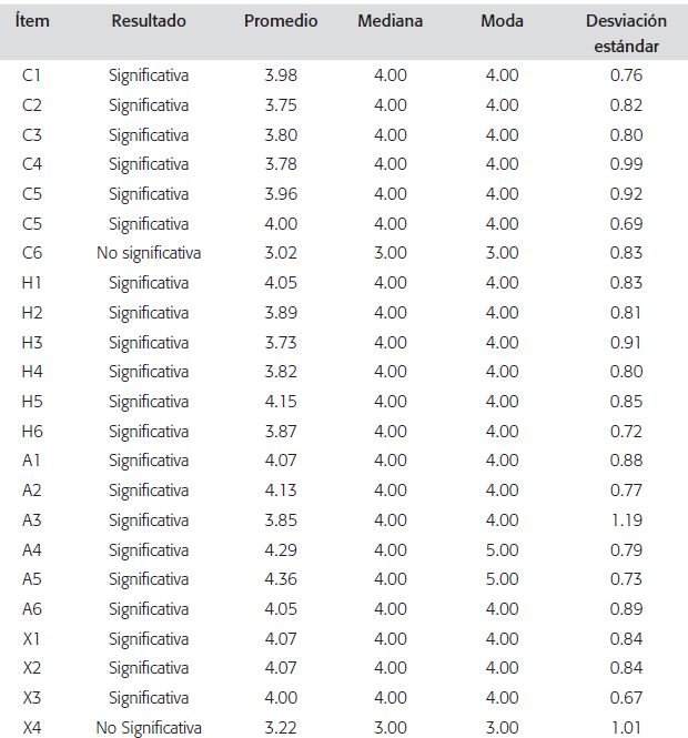 Al realizar el análisis cuantitativo utilizando las medidas de tendencia central, se observa en el Cuadro 6 que la mayoría de las competencias globales obtuvieron promedios mayores a 3.5. De los veintidós ítems propuestos, veinte resultaron significativos para el estudio, sólo los ítems C6, “Conocimiento de la cadena de suministro global”, y X4, “Adquiere experiencias de estancias largas en otros países”, no fueron significativos.