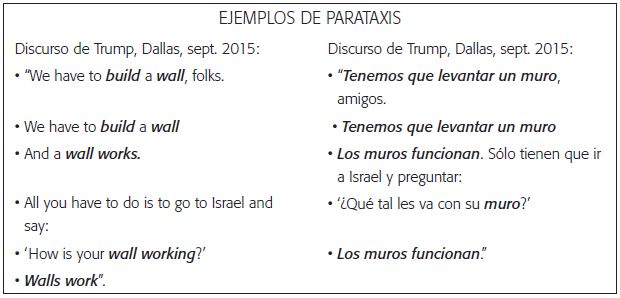 Estas conductas, absolutamente inapropiadas en un hombre de Estado, que evidentemente en este caso Donald Trump no es, son precisamente las que delatan su bajo nivel de inteligencia que se refleja en su impericia, su falta de tacto diplomático y su actuación por impulsos y sin atender observaciones ni recomendaciones de nadie. Esto es así, evidentemente, porque a Trump le cuesta mucho trabajo, y se le vuelve tarea casi imposible, salirse de “su” guión, para el cual le han ayudado desde un principio todos sus estrategas facilitándole recursos retóricos que le simplificaran la tarea de plantear sus argumentos de manera mnemotécnica, machacona, para ayudarle a mantenerse en sus posturas sin meterse en demasiadas complejidades o desafíos. Algunos analistas, como Thompson (2017), han detectado las huellas de sus recursos retóricos, como el de la parataxis (combinación, encadenamiento, sucesión de oraciones o frases coordinadas),9 en frases cuya verbalización acude a la repetición retórica de una idea, a lo sumo. Por ejemplo, cuando lanzó una de sus múltiples andanadas iniciales, la del muro para dividir a Estados Unidos de México, los citados recursos fueron notorios por su eficacia y a la larga por su efectividad.10 La referencia puede ser un tanto ilustrativa: