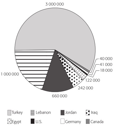 Most of the Syrian refugees are to be found in neighboring countries: with Turkey and Lebanon hosting 3 and 1 million Syrian refugees, respectively (World Vision, 2017; also see Figure 1). The Gulf States host about 1.2 million Syrians on work visas, but they are not legally considered refugees or asylum seekers because those nations are not signatories to the UNHCR commission (Nowrasteh, 2016). At the peak of the European migrant crisis in 2015, 1.3 million Syrians requested asylum in Europe (World Vision, 2017). About 60 000 Syrians were received in North America (World Vision Staff, 2017).