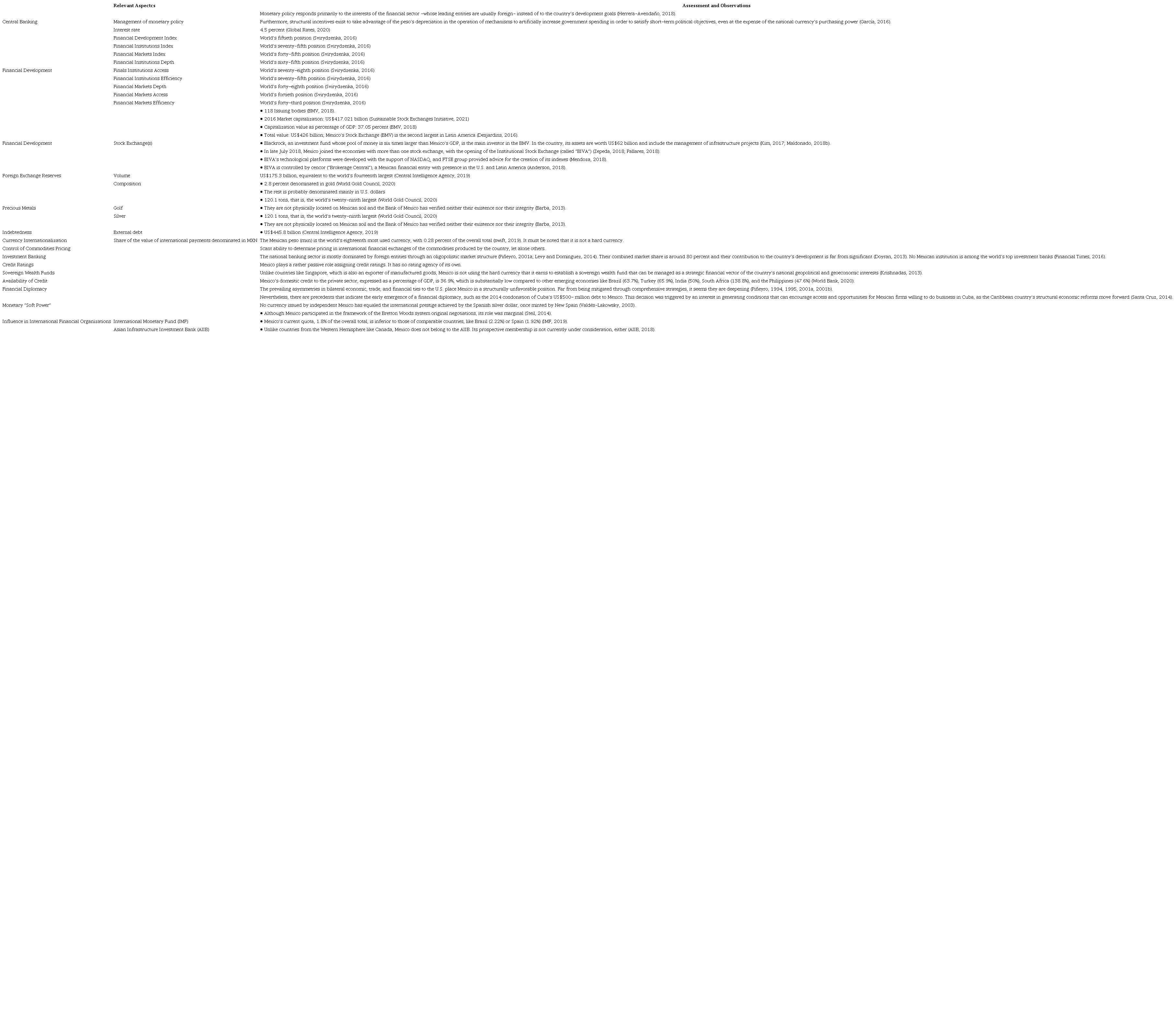 Hence, based on the contents shown in Table 1, Mexico’s financial power is clearly feeble and underdeveloped in terms of central banking, financial development, foreign exchange reserves, holdings of precious metals, indebtedness, currency internationalization, financial control of commodities, investment banking, the ability to assign credit ratings, sovereign wealth funds, credit availability, financial diplomacy, monetary “soft power,” and influence in institutional frameworks related to international financial governance. Moreover, in the hierarchical model called the “currency pyramid” (Cohen, 2010), the Mexican peso is not regarded as a heavyweight. From a holistic perspective, these weaknesses are thus a source of vulnerability in a strategic environment shaped by a growing systemic intersection between geopolitics and international finance.