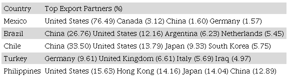 Moreover, it must be kept in mind that the U.S. consumer market absorbs the overwhelming majority of Mexican exports (nearly 80 percent), a reality that compromises the country’s maneuverability in terms of grand strategy. This imbalance is even more astonishing if one compares Mexico’s situation to that of other developing countries that have managed to achieve much more balanced external economic ties. This condition makes it difficult for Mexico to accumulate other hard currencies aside from the U.S. dollar.