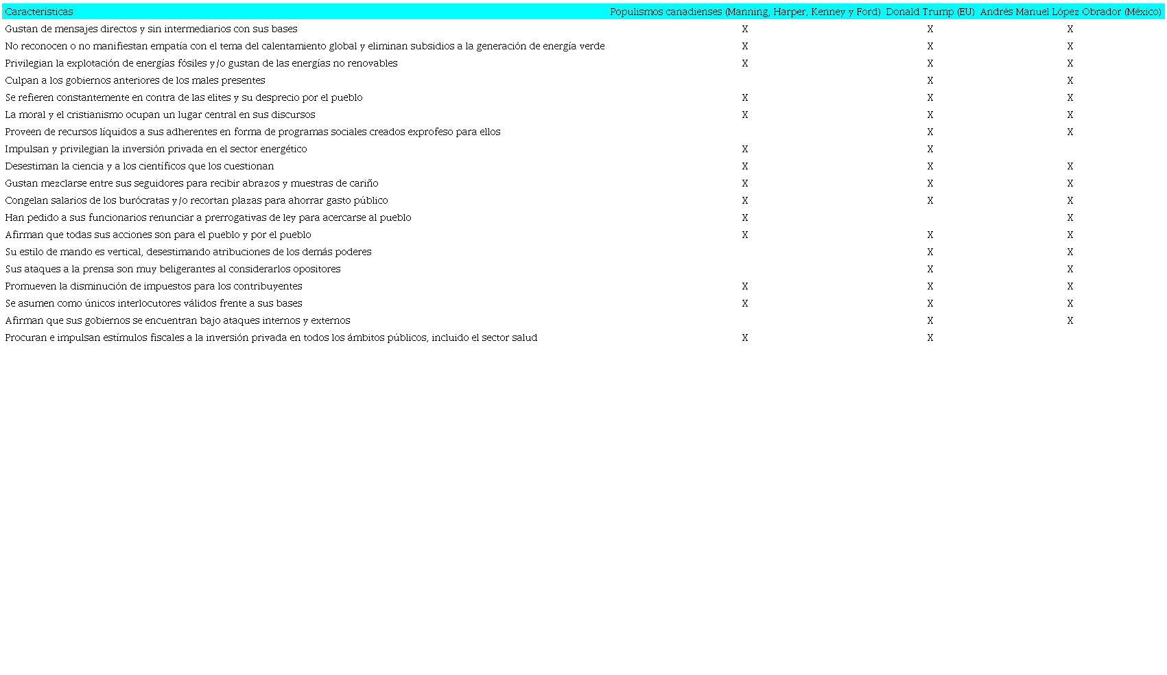 Dicho esto, el cuadro que se presenta a manera de conclusión muestra las coincidencias y diferencias que este artículo ha encontrado en tales movimientos populistas en la región, tanto en la retórica como en las acciones de gobierno. Este cuadro busca contribuir a la construcción de una definición más precisa del populismo en Norteamérica, el cual, pese a tener orígenes diversos, comparte en la práctica dinámicas bastante similares en más de un sentido, como puede verse.