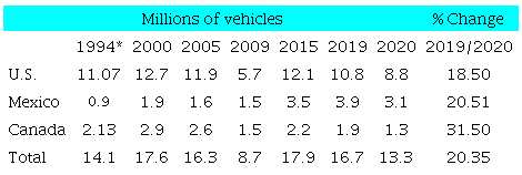 Production. NAFTA’s total car production grew 18.4 percent between 1994 and 2019 (see Table 1). Still, the U.S. and Canada decreased their participation from 11.07 to 10 million and from 2.13 to 1.9 million vehicles, respectively, while Mexico increased from 0.9 to 3.9 million cars. It is necessary to consider that growing participation is related to multinational firms from different countries, mainly from the U.S. In 2020, regional production fell 20 percent due to the covid-19 crisis; Canada was the most affected, falling eleven percentage points under the region’s mean.