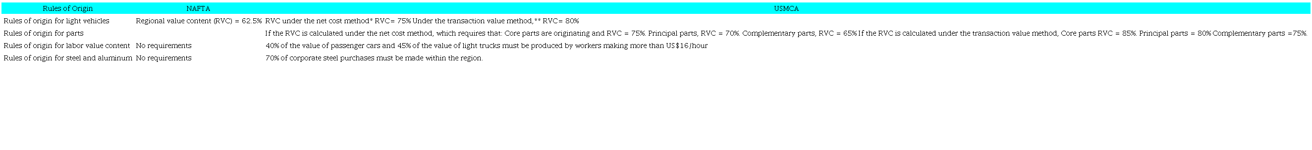 The automotive industry in North America also faces other challenges due to the July 2020 entry into force of the United States-Mexico-Canada Agreement (USMCA), which introduced four critical new rules of origin (ROO) for the automotive industry: (a) increase of regional value content (RVC) requirement for vehicles; (b) a hike in the auto parts RVC depending on their classification (core, principal, and complementary); (c) a first-time regional labor value content (RLVC); and, (d) an RVC for steel and aluminum.