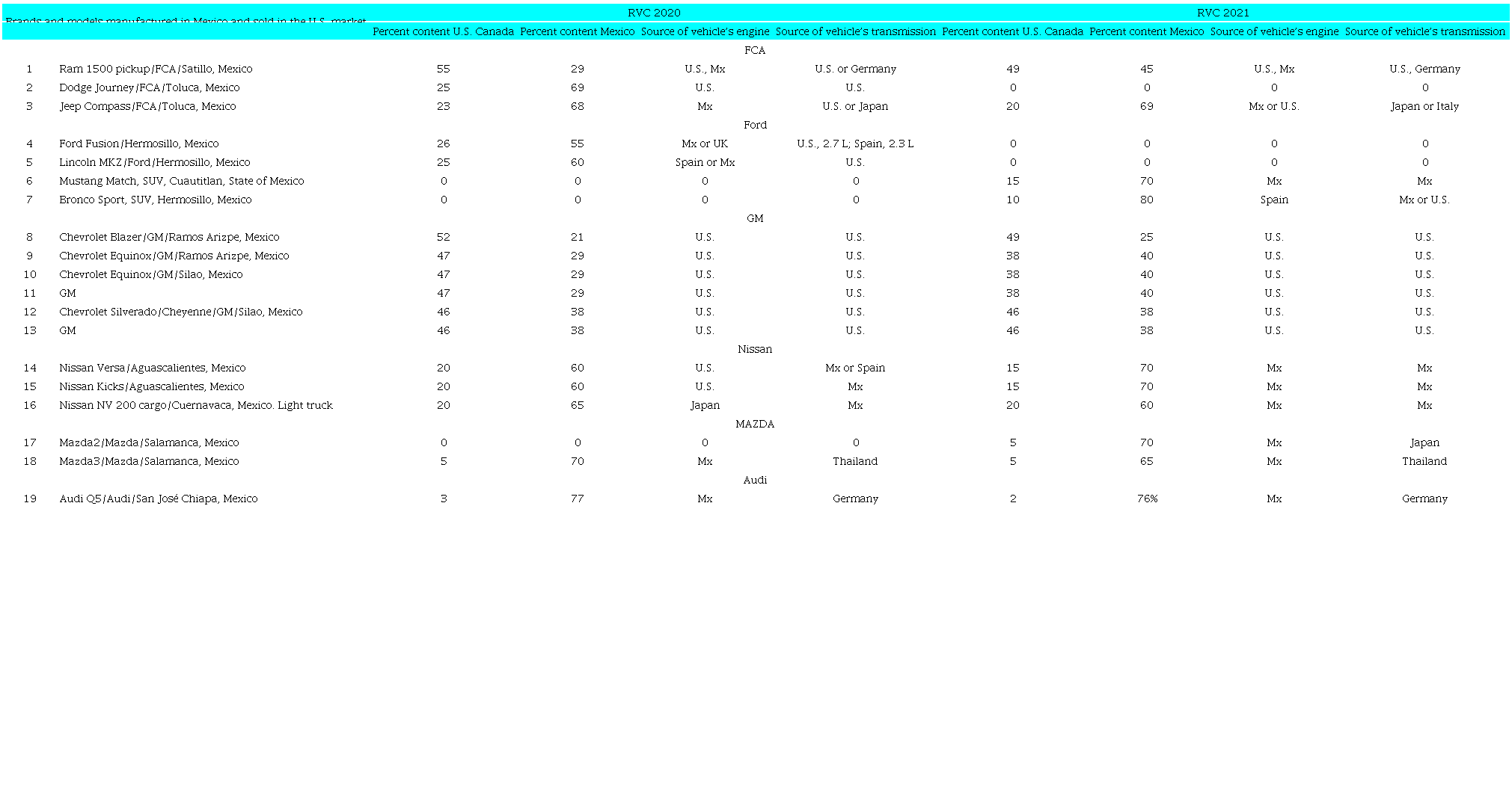 Automotive News 2021 “Mexico Wants Talks with U.S. over Vehicle Content Rules in Trade Pact,” https://www.autonews.com/manufacturing/mexico-wants-talks-us-over-vehicle-content-rules-trade-pact