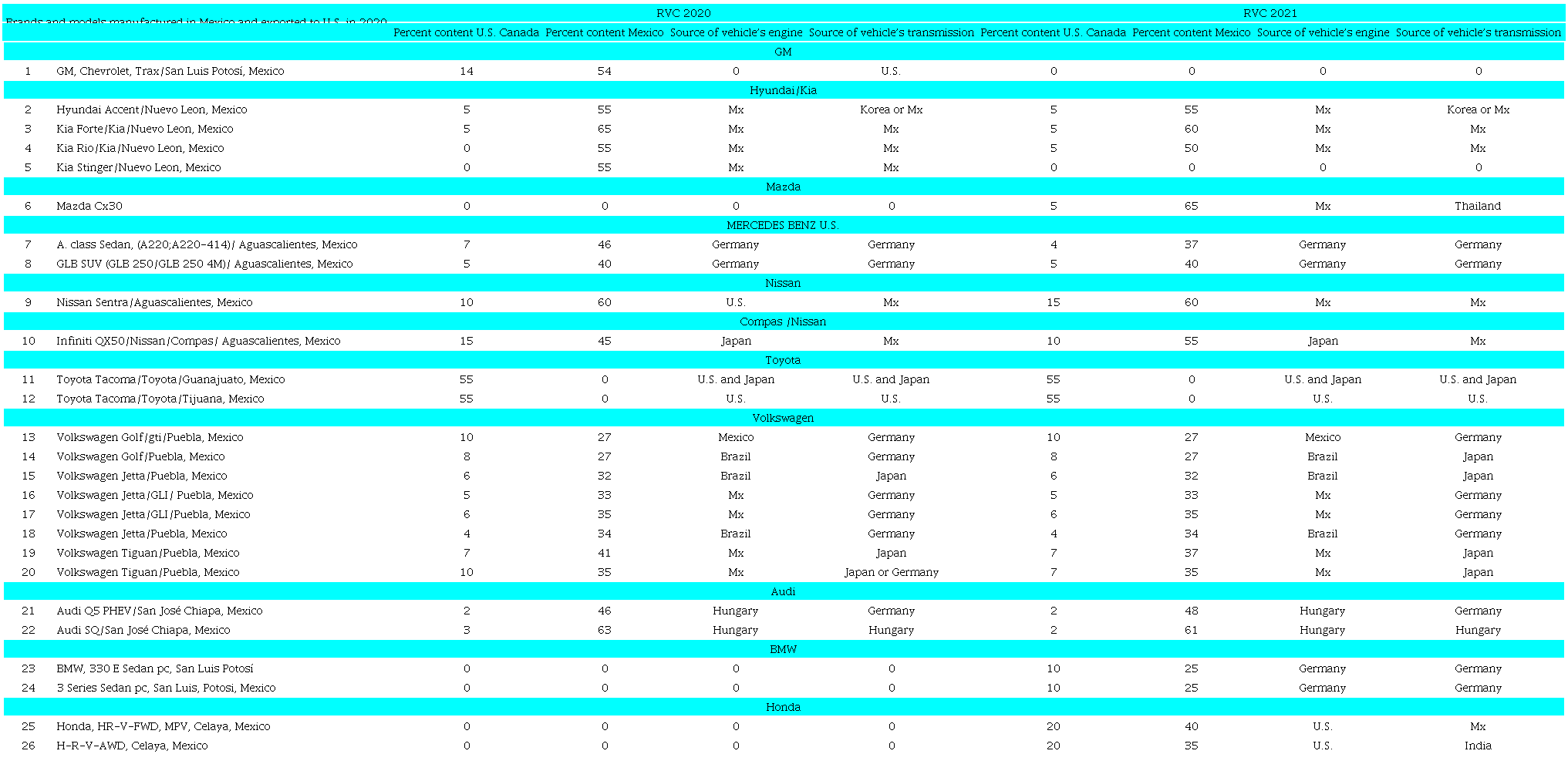 Three of the five models Nissan manufactures in Mexico complied with the 75-percent RVC (Versa, Kicks, and NV 200 Cargo). Nissan kept the same product spectrum; however, it increased these models’ RVC by 1.72 percent in 2020. And finally, Mazda is selling the Mazda 3 with 75 percent RVC in 2020; however, the transmission is from Thailand and will need to be sourced from the USMCA region.