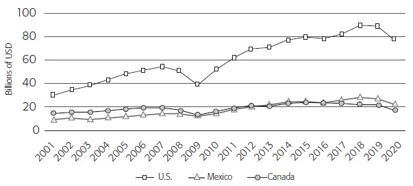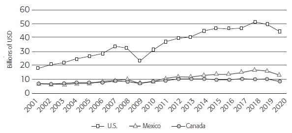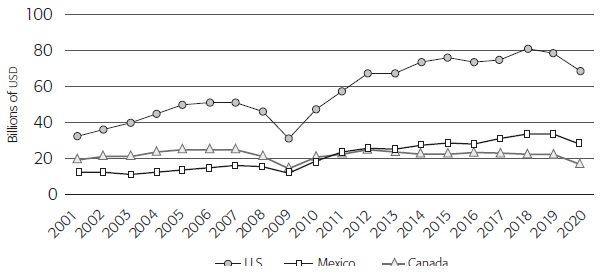 One of the purposes of ROO is to decrease region core-part imports, which grew an AAGR of 4.03 percent in twenty years. In 2020, the region imported US$113 billion, or 16.2 percent less than the previous year; most of the imports (61 percent) are made by the U.S. The drop in imports is a world trend that began in 2019 and grew during the covid-19 crisis. However, it is not yet possible to identify whether the drop in imports is the beginning of the expected trend related to USMCA (see Figure 1).