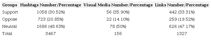 Chi Square statistics was applied to test the six hypotheses of the study using the data from the samples of 500 tweets for each of the three days. H1 sought to examine if there were any differences in the level of engagement (number of hashtags, visual media and links attached to tweets) between the three groups (those who support, those who oppose and those who are neutral). Chi Square statistics revealed that there were no significant differences between the groups. H1 was not supported. Although the differences were not significant, Table 1 shows that those that were neutral had the highest number of hashtags (1686), visual media (78) and links (626) attached to their tweets compared with the other two groups. Those that opposed had the lowest number of hashtags, visual media and links attached to their tweets.