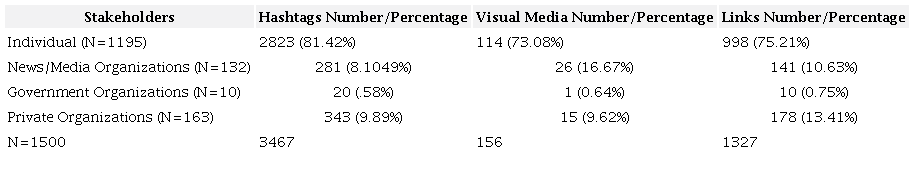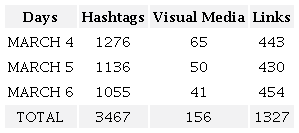 The number of visual media attached was also the highest on March 5 (1286), followed by March 6 (855) and lowest on March 4 (215). In the total sample of this study consisting of 1,500 tweets (500 for each of the three days), the number of hashtags (1912) and the visual media attached (65) were highest on March 4 and the number of links was the highest on March 6 (454).