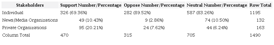 H4: There will be a difference in the type of tweets (support, oppose, neutral) between the different stakeholders (individuals, news/media organizations, government and private organizations).