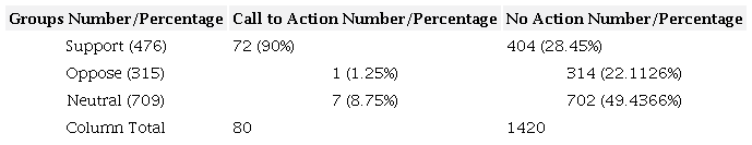 H6: There will be a difference in the tweets that call to action or do not between the three groups (those who oppose, those who support and those who are neutral).