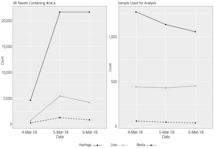 We identified at least 30 hashtags connected to the issue, including the following hashtags: #DACA; #DACANS; #dacadeal; #SaveDACA; #DefendDACA; #Stand-WithDACA; #Pray4DACA; #EndDACA; #StopDACA; #NoDACA; #DACAprotest; #DACASolidarity; #DACArepeal; #DACAmented. We chose the #DACA hashtag because it was top-ranked for this topic by Twitter.