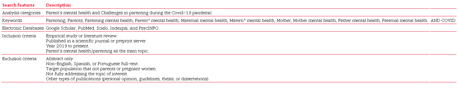 The inclusion criteria for eligible documents included an empirical or literature review study published in a scientific journal or preprint server (such as medRxiv and PsyArxiv) between 2019 and 2020. The articles must have addressed the topic (parenting and parents’ mental health during Covid-19) as the main issue. Due to the rapid need for publication since the pandemic started, we did not consider peer-review as an inclusion criterion.