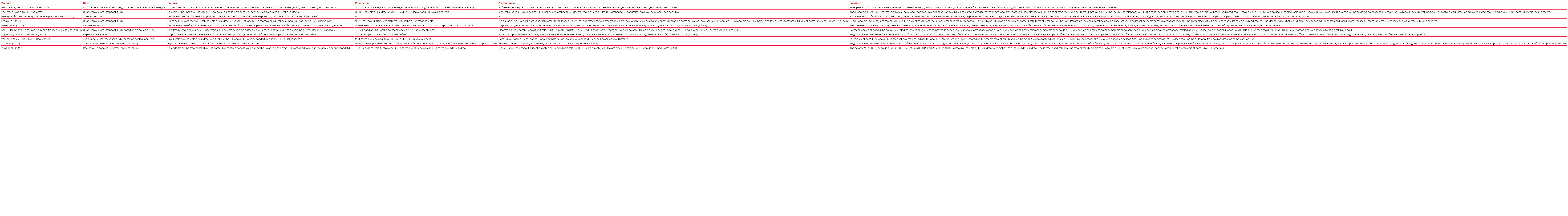 None of the studies directly compared parents/pregnant women with the general adult population (non-parents) during the pandemic to evaluate if the mental health impact of Covid-19 was different. However, Lebel et al. (2020) did compare their findings with another prevalence study in the general population exposed to Covid-19. They found that the rates of clinically relevant symptoms in their pregnancy cohort were higher, suggesting that the outbreak’s psychological impact may be of particular concern for pregnant individuals.