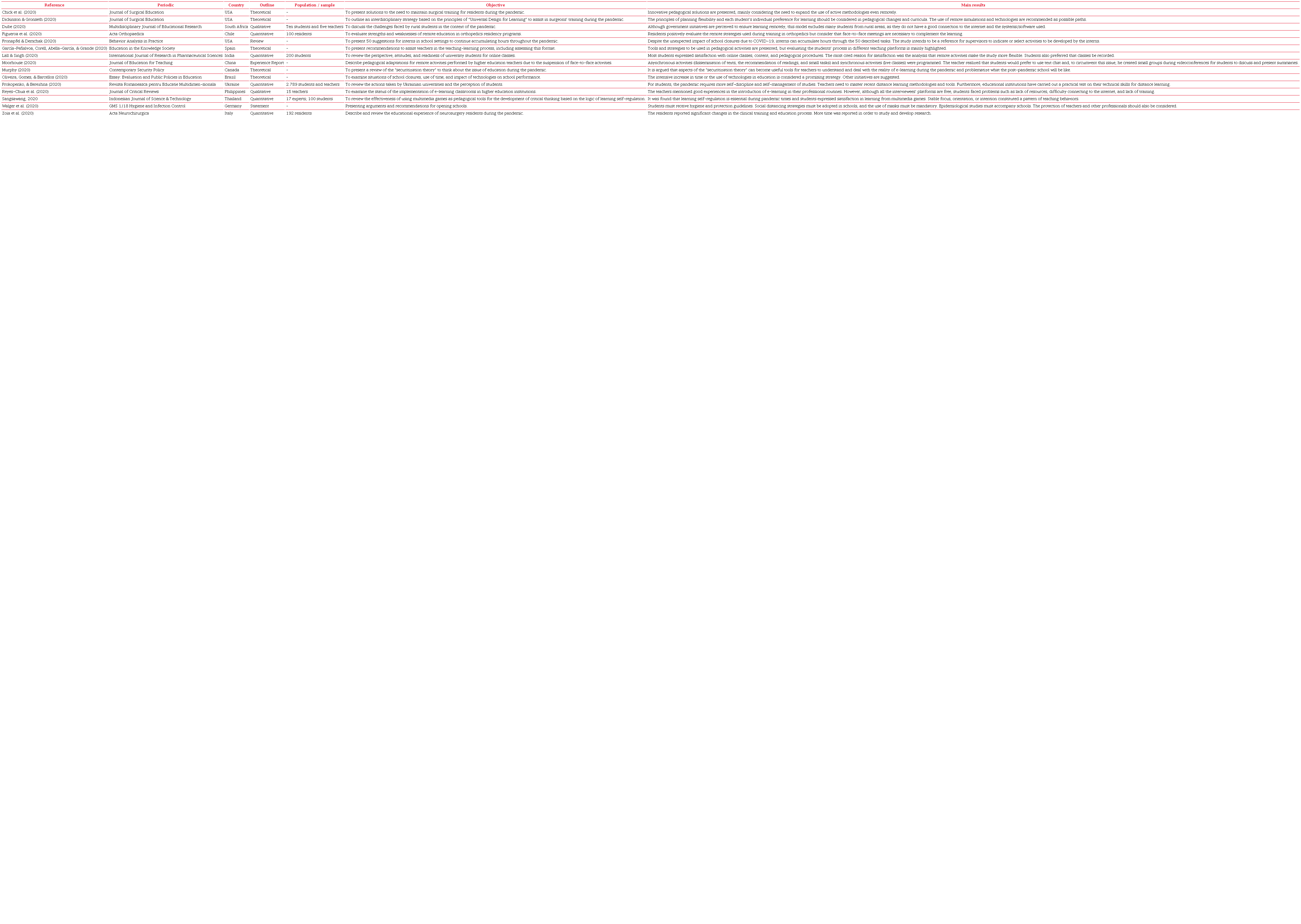 Even with a broad cultural diversity, since the studies originate from 13 countries, no differences between pedagogical concerns or how to deal with pandemic times were recorded. It is also important to note that most studies focused on higher education training, although the greatest number of those affected is in primary education. Moreover, in addition to the articles included in this review, many comments or editorials manifested concerns about universities’ reality in connection to the pandemic. For example, the scientific community is encouraged to think about medical training (Ferrel & Ryan, 2020), as well as to enhance the need to include correct hand hygiene in remote undergraduate nursing courses (Ng & Or, 2020). In psychology, the concern was on the challenges of preparing future professionals for mental health care and the use of ICTs in the training process (Bell et al., 2020).