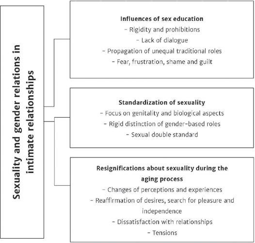 Based on the collected data, three thematic categories were set a posteriori: Influences of sex education; Standardization of sexuality and Resignifications about sexuality during the aging process). The sub-themes are presented in Figure 3.1: