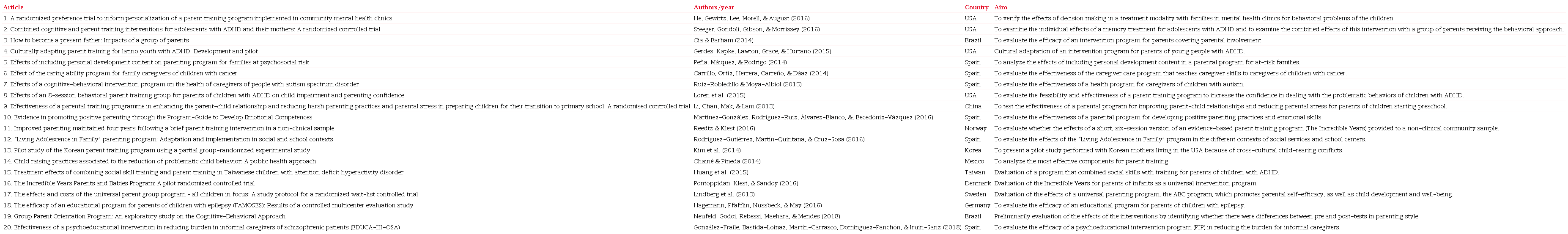 In the number of sessions of the programs, a variation from four to 14 sessions was observed. Regarding the theoretical framework mentioned in the programs, it was observed that, in 12 articles (60%), the specific theoretical framework of the program was not named (1, 5, 6, 9, 10, 12, 13, 14, 15, 16, 17, 18), in five articles (25%) the programs followed the behavioral framework (2, 3, 4, 8, 11), and in three programs (15%) that of Cognitive Behavior Therapy (7, 19, 20) was followed. Considering the results of the programs, 1 study did not present the post-intervention and follow-up data that was the focus of the article (17), and in all the articles the aims were achieved through the indication of improvements after the intervention in the parent group.