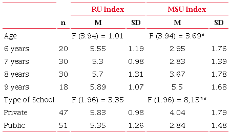 Initially, differences in the ToM task performance were investigated according to age and type of school. Table 3.1 shows the results obtained. Significant differences in age and type of school were found for the MSU Index, but not for the RU Index. Relative to type of school, it was found that students from private institutions scored significantly higher in the MSU Index than did students from public schools. Tukey’s post hoc analysis showed a discrepancy in performance as assessed by the MSU Index between children aged 6 to 7 and those aged 9, the latter performed better than the former. There was no significant difference among the other age groups. No effect was observed for the age/type of school interaction: either on the RU index [F(3.90) = 1.838; p = 0.146] or on the MSU index [F(3.90) = 1.028; p = 0.384]. Although it is not included in the study’s objective, the effect of gender on performance was also investigated, but no effect, either principal or interaction effects with age and type of school, was observed (p > 0.05).