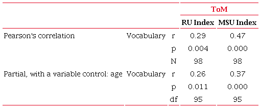 Bivariate relationships were found to be all positive and significant and of low magnitude between vocabulary and the RU index, and moderate between vocabulary and the MSU index. After the age control, the relationships remained significant, but were all of a low magnitude. Thus, higher scores in the vocabulary subtest, which assesses crystallized intelligence, language, and semantic memory, were associated with higher scores in the RU (text comprehension) and MSU (mental state understanding) indexes.