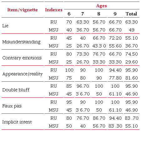 The percentage of correct answers in each ToM task’s item was also analyzed by considering the RU and MSU indexes. These results are shown in Table 3.3, both for each individual age and in the general sample. The data indicate a progression in the number of correct answers for each type of content according to age group, as well as a difficulty gradient for these items. In relation to the RU index, given its role of examining the child’s understanding of the situation expressed in the vignette, a high number of correct responses was expected, as seen in pretending/ fantasy, double-bluffing, gaffe, and implicit intention from 6 years of age onwards. The items involving lies, misunderstandings, and inverted emotions, on the other hand, still seemed to be difficult for some age groups.