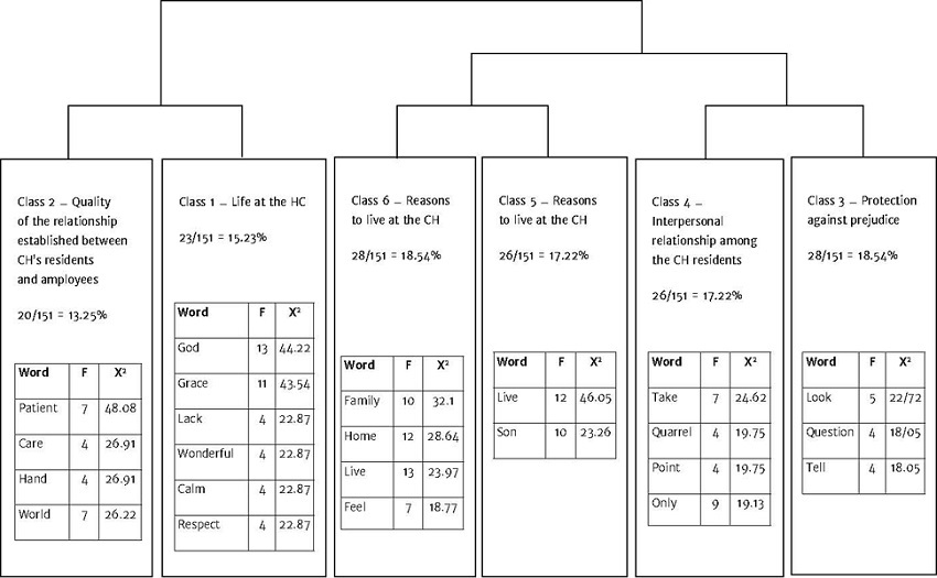 Classes 6 (f = 28 ST – 18.54%) and 5 (f = 26 ST – 17.22%), called “Reasons to live at the CH,” show that the reasons why individuals remain at the CH, even after having being cured of Hansen’s disease, are either because they need it, considering they have nowhere else to live, or because they choose to. Note that, even though some report having a family, living with relatives does not seem to be an option.