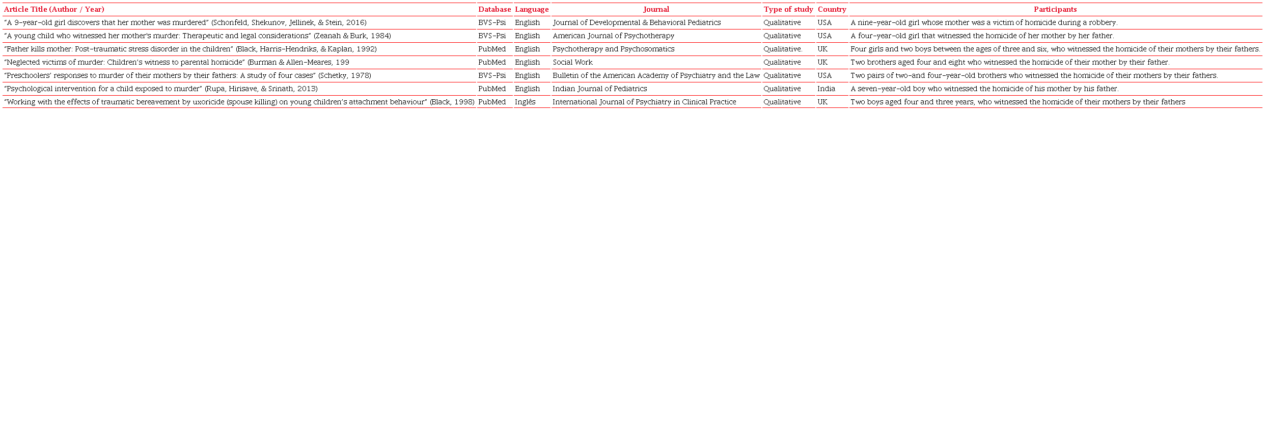 Regarding the methodological design, all the articles found were qualitative through a clinical case study of 17 children aged between two and nine years, including eight girls aged between two and nine years and nine boys aged between two and eight years. Among these children, 16 witnessed the death of their mother, who was the victim of homicide perpetrated by the father.
