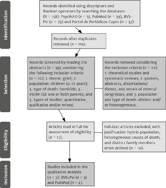 Initially, searches were performed in the Thesaurus of Psychological Index Terms (Thesaurus), in the Medical Subject Headings of the US National Library of Medicine (MESH) and Descritores em Ciências da Saúde (DeCS) to identify the descriptors, which were defined together with the Boolean operators: “Griefs” OR “Mourning” OR “Mournings” OR “Grief” OR “Bereavements” OR “Bereavement” AND “Child” OR “Children” OR “Minors” OR “Development, Child” OR “Development, Infant” OR “Infant Development” OR “Child, Preschool” OR “Children, Preschool” OR “Preschool Child” OR “Preschool Children” OR “Child” OR “Infant” OR “Infancy” OR “Preschool Child” OR “Children, Preschool” OR “Preschool Children” AND “Homicides” OR “Murder” OR “Murders” OR “Killing” OR “Killings” OR “Homicide.” The quotation mark feature was adopted to refine the searches. The “Advanced Search” option was used to narrow the search fields (titles, subjects, abstracts, and keywords). We selected articles in English and Portuguese, using the “language” filter, when available in the database. Exceptionally in the Portal de Periódicos Capes, the following filters were selected to fulfill the inclusion criteria: topic (child) and type of material (article). The final manual search was conducted by the authors in January 2019.