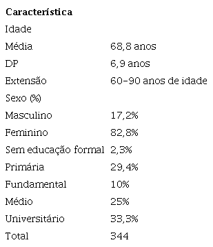 A amostra foi composta por 344 idosos, sendo 17% homens e 83% mulheres com idade a partir de 60 anos (M = 68,8 anos de idade, DP = 6,9 anos). Com relação à escolaridade, 2% não frequentaram ensino escolar formal, 29% frequentaram até a quarta série, 10% completaram o ensino fundamental, 25% completaram o ensino médio e 33% concluíram o ensino superior.