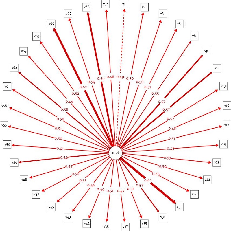 O primeiro modelo alternativo foi elaborado a partir da junção do Fator 1 e do Fator 3 (F1 <-> F3 = 0,81), permanecendo o Fator 2 separado. Dessa maneira, criou-se o novo modelo teórico constituído por 54 indicadores divididos em dois fatores, sendo o primeiro deles formado por 26 itens (junção dos indicadores do Fator 1 e 3) e o segundo, por 10 indicadores, que correspondem ao Fator 2. As análises seguiram os mesmos critérios estatísticos aplicados anteriormente. Após a eliminação dos indicadores com saturações abaixo de 0,40, os índices de adequação encontrados foram: χ2: 638,009; TLI: 0,99; CFI: 0,99; GFI: 0,99; RMSEA: 0,03. Considerando que os índices de ajustamento foram excelentes, não foram realizadas modificações do modelo. Ainda assim, foi importante notar que o Fator 1 possuía indicadores tanto de monitoramento quanto de conhecimento metacognitivo, e a correlação entre os dois fatores foi alta (r = 0,79), demonstrando que existe uma relação estreita e fluida entre eles. Pressupõe-se aqui a viabilidade de ser testado o modelo unidimensional, ou seja, a junção de todos os indicadores em um único fator. Desse modo, foi elaborado o modelo unidimensional, no qual os 54 itens foram agrupados em um único fator e aplicados os mesmos critérios estatísticos para analisá-lo. Foram excluídos 18 indicadores que apresentaram saturações inferiores a 0,40. Os índices de adequação encontrados foram: χ2: 755,418; TLI: 0,99; CFI: 0,99; GFI: 0,99; RMSEA: 0,02.