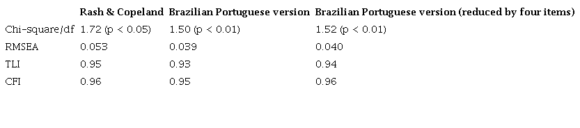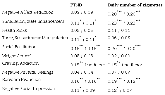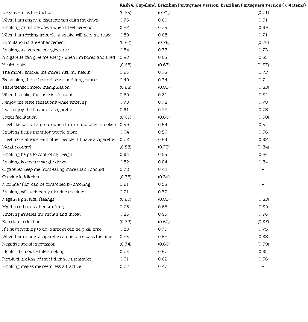 When comparing with the original questionnaire, all subscales displayed lower reliability indices than the ones obtained by Rash and Copeland, except for the Negative Physical Feelings factor, which showed higher indices than obtained by Rash and Copeland. In addition, the item “Smoking makes me seem less attractive” (Negative Social Impression Factor) displayed a low factor loading on the full version and was thus excluded. However, its exclusion lowered the factor reliability from 0.60 to 0.59 in the reduced version.