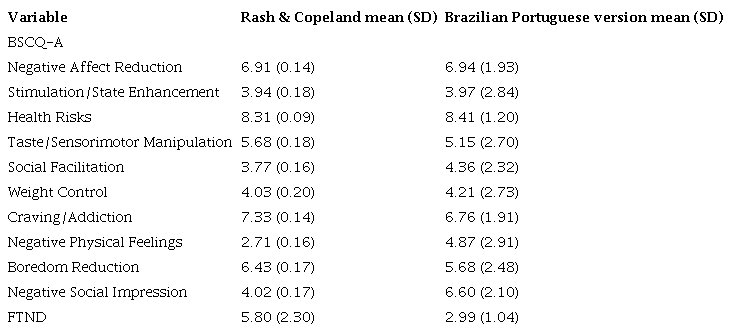 Table 4.4.1 presents the descriptive statistics for the scores of both versions of BSCQ-A, along with the FTND. For comparison, we also showed the results from the original study by Rash and Copeland (2008). While most of the means tended to be similar, it is noticeable that our participants’ standard deviations were much larger than the ones found by the original authors. We used Cohen’s d to calculate the magnitude of the differences between the original study and the full version used in our study. We found that our Brazilian sample scored moderately higher on Social Facilitation (d = 0.36), moderately lower on Craving/Addiction (d = 0.42), and Boredom Reduction (d = 0.43), extremely higher on Negative Physical Feelings (d = 1.05) and Negative Social Impression (d = 1.73), and extremely lower on the FTND (d = 1.57). All other scores showed Cohen’s d lower than 0.10.