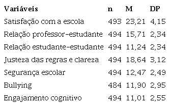 Delaware School Climate Survey - Versão Estudante (Holst et al., 2016): o instrumento é composto por 35 itens (excluindo dois itens de validade) distribuídos em seis subescalas - relacionamento professor-estudante; relacionamento estudante-estudante, justeza das regras e clareza de expectativas, segurança na escola, bullying e engajamento estudantil. Cada subescala é composta por 4 a 6 itens, respondidos por meio de uma escala Likert com quatro opções de resposta, variando de 1 (discordo muito) a 4 (concordo muito). O estudo de adaptação do instrumento para a realidade brasileira apresentou boa consistência interna, com alfa de Cronbach de 0,86 (Bear et al., 2015).