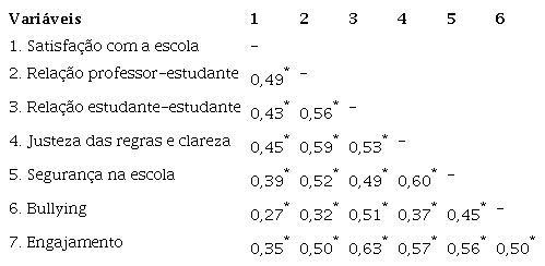 Apesar das variáveis bullying, segurança na escola e engajamento com a escola serem consideradas, em geral, relevantes no contexto escolar, não acrescentaram poder explicativo ao modelo encontrado. Neste estudo, a subescala utilizada para medir o engajamento com a escola inclui itens referentes apenas ao engajamento comportamental e cognitivo (por exemplo, prestar atenção às aulas, entregar os temas de casa). Provavelmente, o engajamento emocional (como gostar do ambiente escolar, ter sentimento de pertencimento e de identificação com a escola) estaria mais relacionado com a satisfação com a escola, mas não é incluído no instrumento utilizado.
