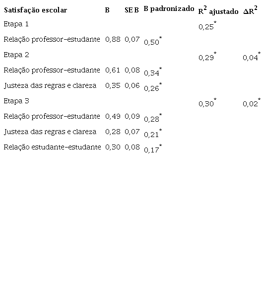 Na Etapa 1, a variável relação professor-estudante permaneceu no modelo, com F(1, 481) = 168,22, p < 0,001, explicando 25% da variação do clima escolar. Na Etapa 2, permaneceram as variáveis relação professor-estudante e justeza das regras e clareza das expectativas, com F(2, 480) = 98,53, p < 0,001, explicando 29% da variação. Por fim, na Etapa 3, o modelo incluiu as variáveis relação professor-estudante, justeza das regras e clareza das expectativas e relação estudante-estudante, com F(3, 479) = 71,37, p < 0,001. Apesar de todos os modelos terem sido estatisticamente significativos, o modelo disposto na Etapa 3 explicou o maior percentual de satisfação com a escola (30% da variação). No entanto, pode-se observar que a relação professor-estudante é a variável mais importante para explicar o clima escolar, pois as demais variáveis que se mostraram significativas na Etapa 3 pouco acrescentaram ao poder explicativo do modelo. As demais variáveis de clima escolar não entraram no modelo final por não terem contribuído de forma estatisticamente significativa com a habilidade do modelo de prever satisfação com a escola, após a inclusão das variáveis anteriormente mencionadas.