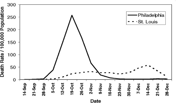 A Spanish study of public health interventions and epidemic intensity during the 1918 influenza pandemic published in 2007 clearly shows how the social isolation imposed on the city of St. Louis flattened the contagion curve, significantly reducing the mortality rate (Hatchett et al., 2007). Figure 1 depicts the contrast of mortality results between Philadelphia and St. Louis, showing how the flattening of the contagion curve, obtained through social isolation, was essential in reducing mortality rates in the pandemic period.