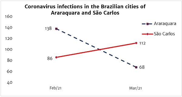 An example similar to the one identified in Hatchett et al. (2007) study on the Spanish flu can be seen in the specific context of Covid-19 in Brazil. According to an article published on the portal of the University of São Paulo, the cities of São Carlos and Araraquara, in the state of São Paulo, which are less than 50 km apart from each other and have a lot of similarities, such as the number of inhabitants, population density, per capita income, health conditions, among others, presented a drastic difference in the number of cases of Covid-19 infection, given the different restriction measures adopted. After a period of austere social isolation, Araraquara showed a considerable drop in the number of new daily cases of Covid-19, from 138 in February 2021 to 68 cases in March. Meanwhile, São Carlos, which did not adopt the same restriction measures, showed a considerable increase in the number of new cases, 86 in February 2021 and 112 in March, as shown in Figure 2.