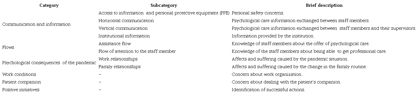 The most contacted professional categories were nursing technicians, nurses, and physicians, and, to a lesser extent, security guards, cleaning staff, among others. In an institutional diagnosis, the collection of information does not follow the patterns, as in academic research, of “a careful, detailed and complete recording of events, but rather an operative inquiry” (Bleger, 1984, emphasis added by the author). Thus, psychologists prioritized a spontaneous dialogue, taking notes of important contents after the meetings.