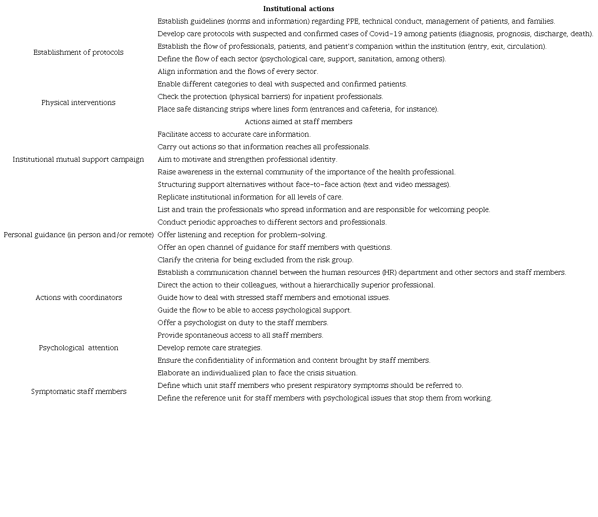 The institutional diagnosis and the action plan were presented at a meeting with the hospital management and representatives from other sectors of the institution, members of a crisis management group. At this meeting, with the contribution of all those present, the actions and actors of each intervention were defined. Established in an action plan, the proposed actions were divided into two major categories, as shown in Table 2. Regarding the institutional actions, two subdivisions were elected: the establishment of protocols and interventions in the physical space. The actions aimed at staff members was subdivided into five groups of interventions: institutional communication campaign of mutual support; personal guidance (in person and/or remote); actions with coordinators; psychological attention; and referral of staff members with symptoms.