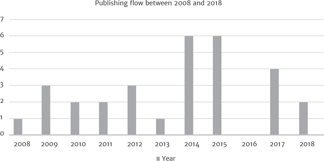There were two years in which the flow of publications on the subject had a higher incidence, 2014 and 2015, with six publications per year (Figure 1). In addition, we can highlight the year 2017 with four publications, and 2009 and 2012, with three. We observed an inconsistent production pattern in the period between 2008 and 2018 due to the fluctuation in the frequency of publications: the years 2014 and 2015 represent the optimal point in the figure; in 2016, there was no material on the subject; and there was a sharp production oscillation from 2013 (one publication) to 2014 (six publications).