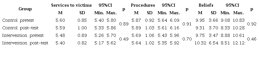 The variables perceptions regarding the services provided to victims (Z = 0.69, p = 0.49) and procedures implemented in IPV cases (Z = 0.38, p = 0.70) presented a slight but non-significant decrease in the intervention group; and beliefs improved but not significantly (Z = 0.73, p = 0.46). The Wilcoxon test showed a similar pattern in the control group, with a slight decrease in the scores for the victim’s services (Z = 0.11, p = 0.91) and beliefs (Z = 0.10, p = 0.92) and a small advance in assistance procedures (Z = 0.13, p = 0.90), with no significant differences. Table 1 presents the means obtained for the groups in each of the variables assessed by the scales of perception and beliefs in the pretest and post-test.