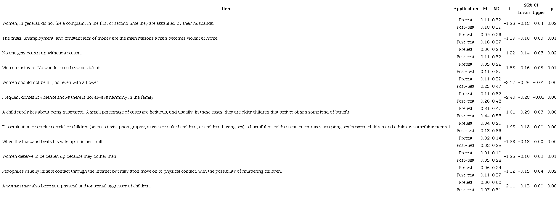 The Kruskal-Wallis test was performed for each of the items in the perception scale for both groups. A significant change was observed in questions 5 (“Understanding the resistance of victims in filing a complaint”) (p = 0.02, Cohen’s d = 0.30) and 6 (“Assessing the victim’s needs”) (p = 0.05, Cohen’s d = 0.18) for the control group and question 8 (“Keeping contact with the victim”) for the intervention group (p = 0.03, Cohen’s d = 0.01). The same test was performed for the beliefs questionnaire. Significant differences were found in questions 6 (“Alcohol consumption is the primary cause for men mistreating wife and children”) (p = 0.04, Cohen’s d = 0.01) and 8 - (“Children who witnessed their mothers being assaulted by their fathers often feel guilty for the violence”) (p < 0.01, Cohen’s d = 0.18).