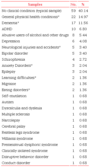 Individuals with typical development composed the sample in 40% of the studies (Table 2), which refers to studies that did not investigate clinical samples. Most of the studies surveyed individuals with some clinical condition, with emphasis on people with some general physical health conditions (22 studies), dementia (17 studies), ADHD (10 studies), and abusive users of alcohol and other drugs (8 studies).