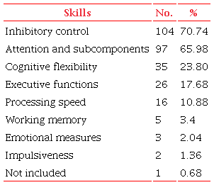 Table 3 details the number and percentage of studies that reported the cognitive constructs measured using paradigm-based instruments. Concerning the cognitive skills assessed by the tasks, inhibitory control was the most mentioned (70.74%), followed by attention (65.98%). One study did not report which skill was assessed by the task based on the Stroop paradigm.