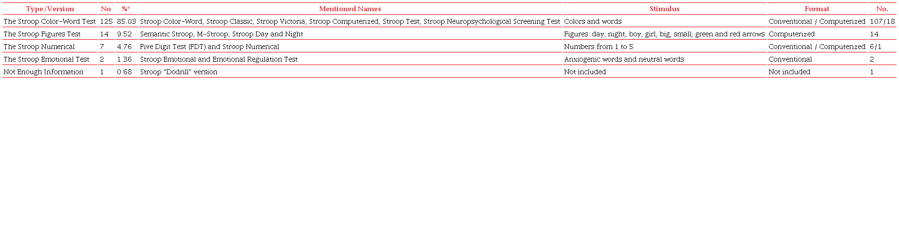 It was found that the traditional Stroop Color-Word Test version was the most used (in 85.03% of the studies), followed by the Stroop Figures, the Stroop Numerical, and the Stroop Emotional Tests versions. This data corroborates the literature that indicates a wide use of the original Color-Word version (Campanholo, 2018; Ramos & Hamdan, 2016; Santana et al., 2019; Silva et al., 2017) while highlighting the heterogeneity of the versions derived from it. The presentation of the items in the studies was quite varied, even in the Stroop Color-Word Test version. The items presented rectangles, circles, and words (neutral or color names) in black, different colors, and varied configurations and orders. This is an aspect to be considered since using other versions, or stimulus configurations/presentations of the same version may compromise the comparability among findings from different studies, with some standardization being desirable.