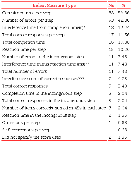 There was also variability in the types of scores recorded by the studies. The most recorded were the completion time per step (59.86%) and the number of errors (42.86%). Only about 10% of the studies recorded reaction time associated with the limited use of computerized versions. Similar results were reported in the review by Scapina and Tangini (2017), showing that the Stroop Color-Word Test mainly considered the parameters of speed and accuracy. However, the form of measurement varied greatly among Italian studies. The authors suggest that effective measures of the Stroop Color-Word Test should include: 1) the time and accuracy (correct responses) in each condition and 2) a global index calculated to relate the performance in the incongruent condition with word reading and color naming skills. The second aspect highlighted by the authors was not considered in the indexes found.