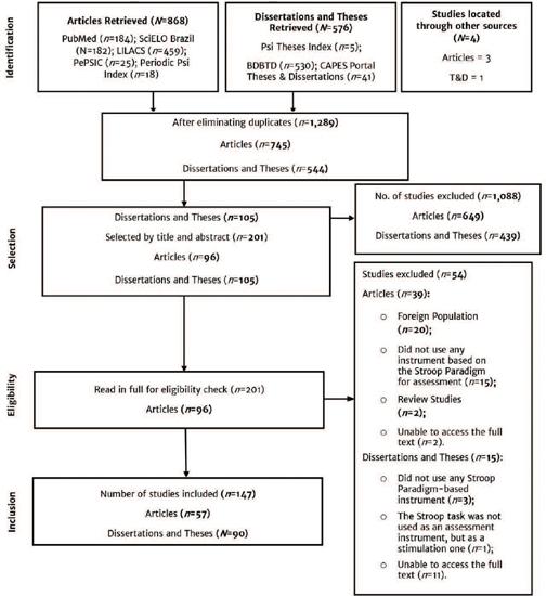 For the initial survey of studies in this review process, the following inclusion criteria were used: a) being an empirical study; b) being a Brazilian study; c) having used an instrument based on the Stroop Paradigm for evaluation purposes; d) using a typical or atypical sample of participants from any age group of the life cycle (human studies); e) having been published between 2000 and 2022 (see below the topic about updating the search), and f) published in the Portuguese, English or Spanish languages. As exclusion criteria, the following were considered: a) review studies or theoretical studies; b) studies that did not use any assessment instrument based on the Stroop Paradigm; and c) studies conducted with foreign populations.
