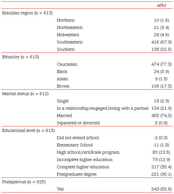 The sample of the present study is composed of 625 women, aged between 18 and 44 (M = 31.6; SD = 5.3), with an infant up to 6 months old at the time of their participation. The participants come from the five regions of Brazil, mainly from the Southeastern region (n = 416, 67.9%), followed by the Southern region (n = 138, 22.5%), with the Northern region being the least represented (n = 10, 1.6%). Most participants reside in the state of São Paulo (n = 341, 55.6%), and five states did not have any participants in the study (Roraima, Tocantins, Alagoas, Maranhão, and Piauí). The sample is mainly composed of Caucasian participants (n = 474, 77.3%), married (n = 455, 74.3%), primiparous (n = 349, 55.8%), and with a college degree (n = 438, 71.5%). Table 1 presents detailed information on the characterization of the participants. The infants’ ages ranged between 2 and 209 days (M = 102; SD = 52), corresponding to a mean age of approximately three months and ten days.